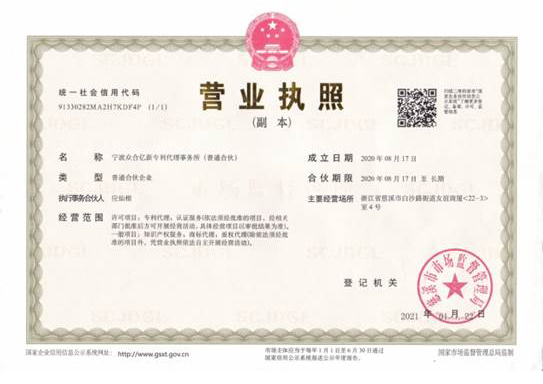 浙江億新知識產(chǎn)權(quán)服務(wù)有限公司前身為慈溪眾合知識產(chǎn)權(quán)代理事務(wù)所,創(chuàng)始于2004年,為了服務(wù)更多的創(chuàng)新企業(yè),實(shí)現(xiàn)“服務(wù)億萬創(chuàng)新企業(yè)”的理念,后更名為浙江億新知識產(chǎn)權(quán),旗下公司包括:寧波眾合億新專利代理事務(wù)所(機(jī)構(gòu)代碼33405)、中范(北京)認(rèn)證有限公司。其中寧波眾合億新專利代理事務(wù)所是慈溪市科技服務(wù)聯(lián)盟理事單位,前灣區(qū)知識產(chǎn)權(quán)工作站。公司位于浙江省慈溪市文化商務(wù)區(qū)友誼商廈,并在北京、青島設(shè)有辦事處。